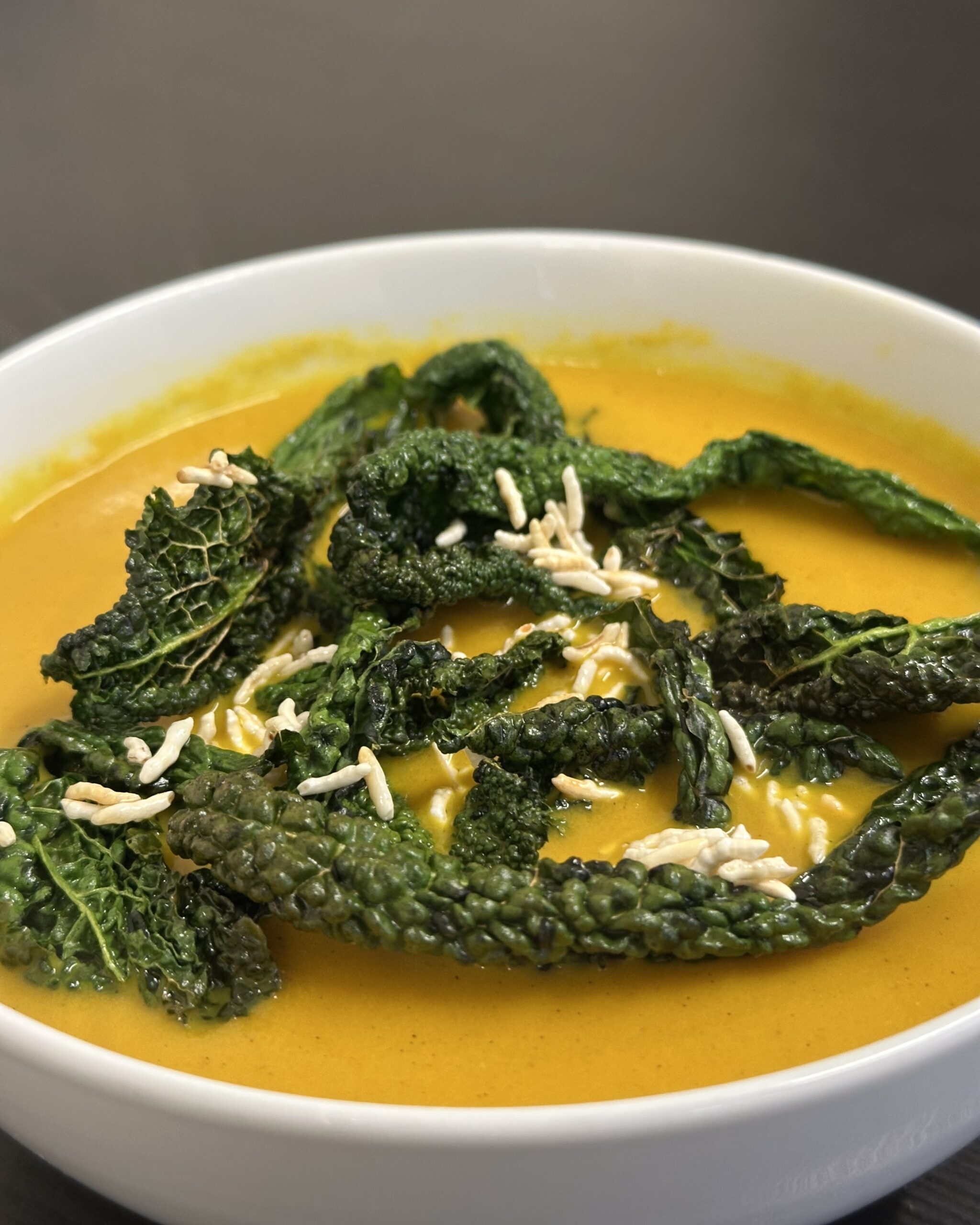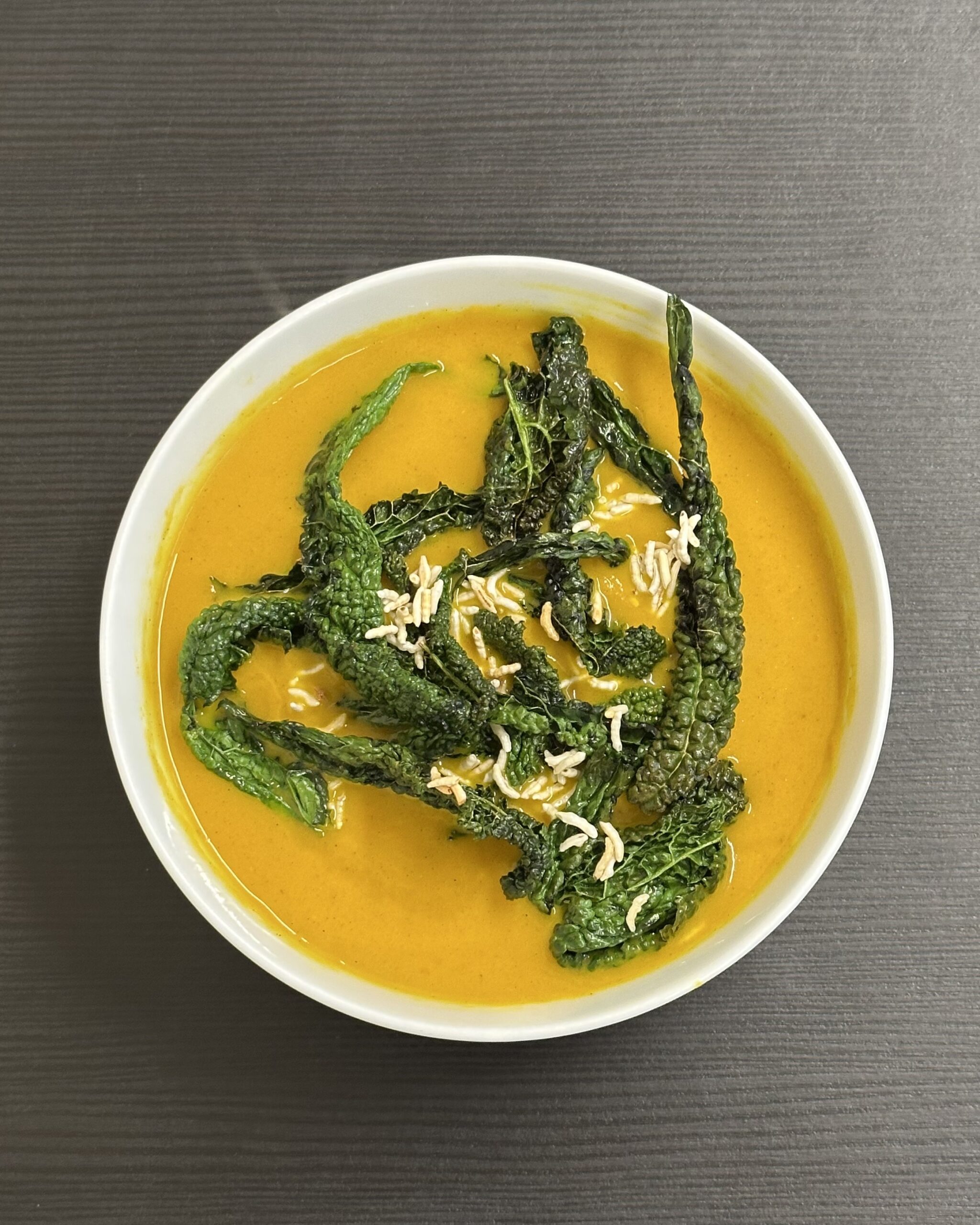 Curried Carrot Soup, With Crispy Cavolo Nero & Puffed Rice 🥕🥬